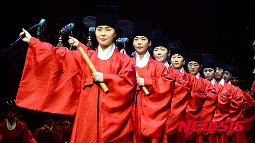 종묘제례악은 조선왕조의 역대 제왕과 왕후의 신주를 모신 사당인 종묘에서 그들을 기리는 제사를 뜻하며, 오는 9월18일부터 19일까지 한-불수교 130주년 ‘2015-2016한-불 상호교류의 해’ 개막작으로 프랑스 국립샤이오극장에서 공연한다. 2015.06.11.