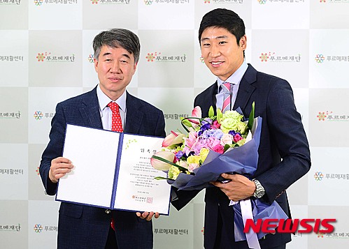【서울=뉴시스】김진아 기자 = 축구선수 이근호가 23일 서울 종로구 푸르메재단에서 열린 홍보대사 위촉식에서 위촉장을 들고 기념촬영을 하고 있다.