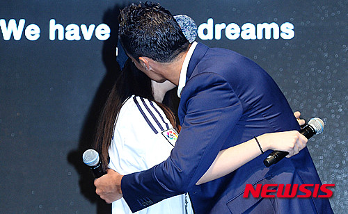 【상해(중국)=뉴시스】박문호 기자 = 축구스타 크리스티아누 호날두(30, 마드리드)가 9일 오후 중국 상해 푸동 리츠칼튼호텔에서 열린 일본 미용 전문기업 MTG사의 신제품 EMS(전자기 근육 자극) 근육 운동기구 '식스패드' 발표회에서 팬과 포옹한 뒤 가벼운 키스를 해주고 있다.