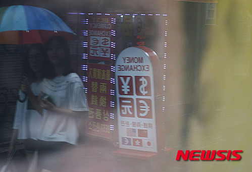 【서울=뉴시스】임태훈 기자 = 그리스의 디폴트(채무불이행) 사태와 중국 주식시장 폭락으로 한국 경제시장이 위축 될 것으로 예상된 12일 오전 서울 중구 명동의 환전소 앞을 시민들이 지나가고 있다.