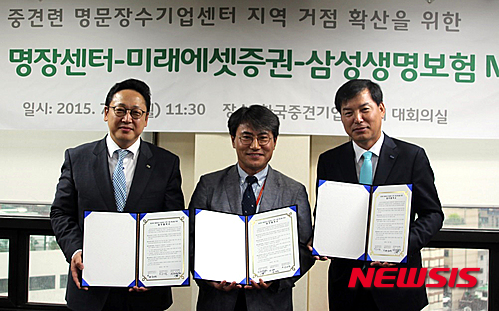 왼쪽부터 김대환 미래에셋증권 WM본부장, 윤성철 중견련 명장센터장, 강대호 삼성생명보험 WM사업부장이 기념촬영을 하고 있다. 2015.07.13. (사진=한국중견기업연합회 제공)