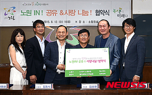 오른쪽부터 윅스위즈 유창화 대표, 끌라르떼 사진예술원 김금용 대표, 김성환 노원구청장, LG전자 BESTSHOP 노원본점 김동식 지점장, 골든키 황원상 대표, 한복천하 김광영 대표. 2015.08.12. (사진=노원구 제공)
