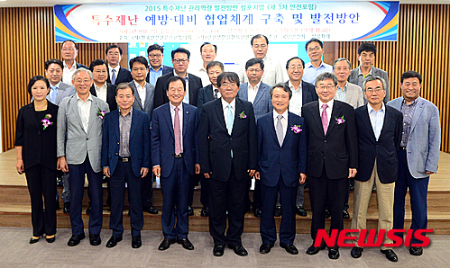 【서울=뉴시스】조성봉 기자 = 2일 오전 서울 중구 삼성화재 본관 국제회의장에서 열린 특수재난 예방, 대비 협업체계 구축 및 발전방안 심포지엄에 서 윤인섭(가운데) 한국안전전문기관협의회 회장, 권도엽(오른쪽 네번째) 안전생활실천시민연합 공동대표, 김경수(오른쪽 세번째) 국민안전처 특수재난실장을 비롯한 참석자들이 기념촬영을 하고 있다. 2015.09.02.