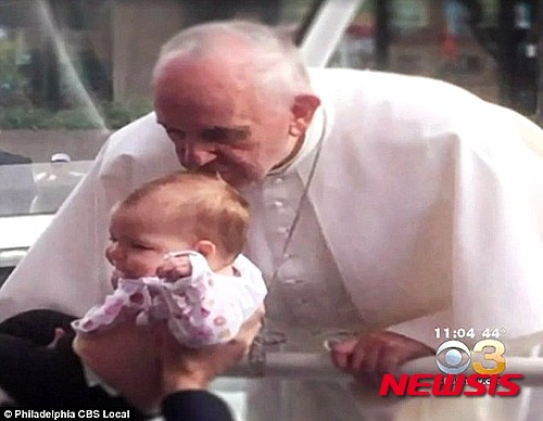 【서울=뉴시스】교황 프란치스코가 뇌종양을 앓고 있지만 수술하는 것도 불가능했던 한살박이 미 여아의 머리에 키스를 한 후 여아의 뇌종양 크기가 눈에 띄게 줄어들면서 건강을 회복해 교황의 기적이란 주장이 나오고 있다. 지난 9월 미 필라델피아를 방문햇을 당시 지안나 마시안토니오의 머리에 키스하는 프란치스코 교황의 모습. <사진 출처 :CBS 방송화면 캡처> 2015.11.23