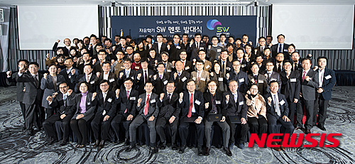 【서울=뉴시스】최진석 기자 = 최재유 미래창조과학부 제2차관이 9일 오전 서울 강남구 노보텔 앰배서더 호텔에서 열린 '자유학기 소프트웨어(SW) 멘토 발대식' 에서 김진형 소프트웨어정책연구소장 및 발대식에 참여한 기업, 학회, 협회, 공공기관 대표들과 기념촬영 하고 있다. 2015.12.09. (사진=미래창조과학부 제공)