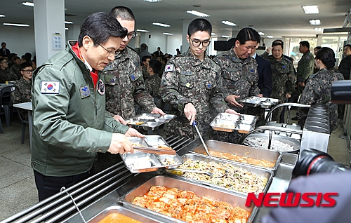 【충주=뉴시스】이성기 기자 = 30일 국군장병 위문차 공군 19전투비행단을 방문한 황교안 국무총리가 공군장병들과 함께 점심식사를 하기 위해 식판에 밥과 반찬을 담고 있다. 황 총리는 이날 "어려운 여건에도 주어진 임무에 최선을 다하는 여러분의 노고를 치하한다"며 "현대전에서 전쟁의 승패를 좌우하는 공군력의 중요성은 날로 증대되고 있으며, 우리 공군의 핵심주력인 여러분이 조국 영공방위 임무를 믿음직하게 수행함으로써 국민이 편안하게 생활할 수 있다"고 장병들을 격려했다.2015.12.30(사진=공군 19전투비행단 제공)
