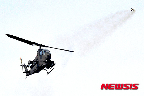 【양평=뉴시스】박진희 기자 = 지난해 30일 오후 경기도 양평군 비승사격장에서 육군 항공작전사령부와 11사단이 병신년 새해를 맞이하여 전투의지를 고양하고 완벽한 전투 대비태세 확립을 위해 대규모 육군항공 사격훈련을 하고 있다. 사진은 전차킬러 AH-1S 공격헬기가 토우(Tow) 미사일을 표적지에 발사하고 있다. 2016.01.02.