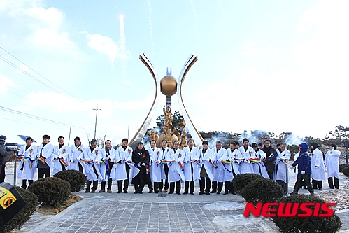 동학농민혁명 최초 봉기인 고부봉기를 기념하기 위해 조성된 상징조형물의 제막식이 함께 열려 관계자들이 기념촬영을 하고 있다. 2016.02.15. (사진 = 정읍시 제공)