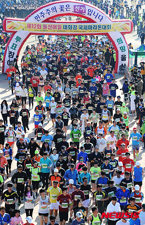 대회는 5km와 10km, 하프, 풀코스 4종목으로 나눠 진행되며 종목별로 남녀를 구분해 시상한다. 울산매일 신문사가 주최하고 국민생활체육 울산시육상연합회(회장 배달식) 주관으로 치러지는 이번 대회에는 개인과 단체를 포함, 전국에서 약 5,000명의 선수가 출전할 예정이다. 국제마라톤 대회의 명성에 걸맞게 외국인 마라토너 400여명도 참가한다. 2016.03.23.(사진=작년 마라톤대회 울산매일 제공)