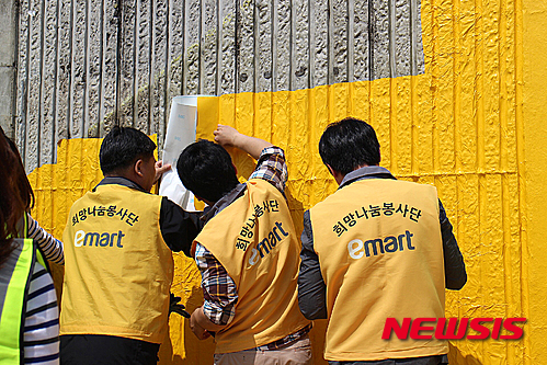 【서울=뉴시스】15일 인천 서구 왕길초, 창신초 앞 건널목에서 이마트 주부봉사단과 임직원, 학부모 봉사자 등이 참여한 가운데 어린이 교통사고 예방을 위한 '옐로카펫' 설치작업이 한창 진행되고 있다.