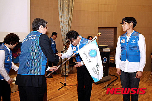 【서울=뉴시스】김선웅 기자 = 지난 26일 오후 서울 노원구 삼육대학교 요한관 홍명기홀에서 '2016 삼육대 하계 해외봉사대 발대식'이 진행되고 있다.