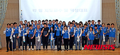 【서울=뉴시스】김선웅 기자 = 지난 26일 오후 서울 노원구 삼육대학교 요한관 홍명기홀에서 열린 '2016 삼육대 하계 해외봉사대 발대식'에서 참가 교수와 학생들이 기념촬영을 하고 있다.