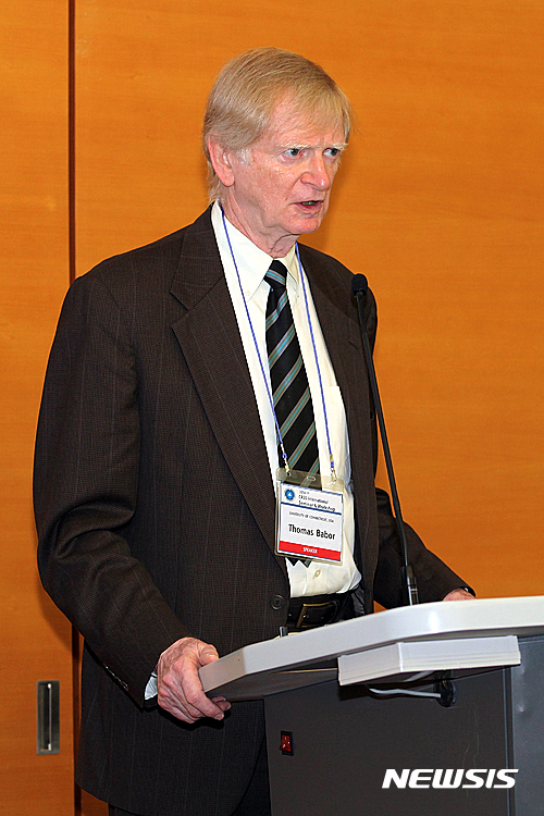 【서울=뉴시스】고승민 기자 = 19일 삼육대 백주년기념관 장근청홀에서 열린 '중독 국제세미나 및 중독 교육과정 워크샵'에서 중독분야의 최고 권위자인 코네티컷 대학 토마스 베이버(Thomas Babor) 교수가 ‘우리 교육과 훈련은 글로벌 중독 연구의 인프라에 어떻게 부합하는가? 새롭게 구축되고 있는 글로벌 중독 과학 인프라에서의 중독연구 프로그램들의 역할은 무엇인가?’를 주제로 기조강연을 하고 있다. 2016.06.19. (사진=삼육대 제공)