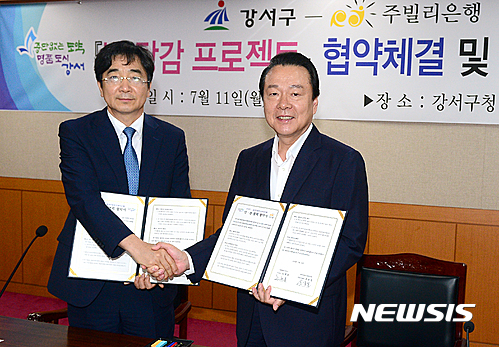 【서울=뉴시스】김동민 기자 = 노현송 강서구청장이 11일 오전 서울 강서구청 대회의실에서 열린 ‘강서구·주빌리은행 빚 탕감 프로젝트 협약체결 및 부실채권 소각식’에 참석해 유종일(왼쪽)주빌리은행장과 협약 체결 후 기념 촬영을 하고 있다.