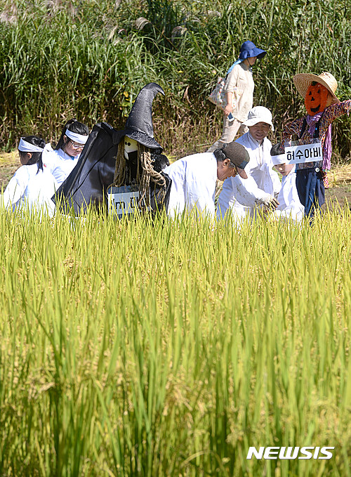 【서울=뉴시스】장세영 기자 = 4일 오전 서울 둔촌동 일자산 도시농업공원 내에 위치한 생태텃논에서 초등학교 학생들이 함께 ‘가을걷이’ 벼베기 체험을 있다.