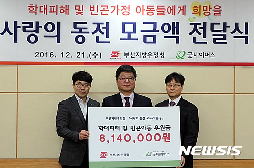 부산우정청은 지난 5월부터 부산·울산·경남지역 우체국과 취급국에 동전함을 비치, 사랑의 동전 모으기 운동을 벌여 810만원 상당의 기금을 모아 굿네이버스에 전달했다.