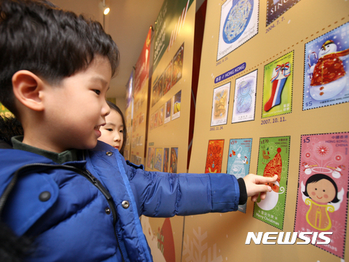 【서울=뉴시스】크리스마스 우표 특별전시회가 23일 중구 서울중앙우체국 우표박물관에서 열려 어린이 관람객들이 크리스마스 우표를 관람하고 있다.