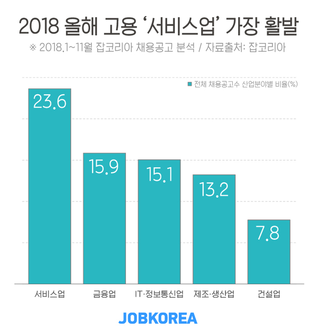 올해 채용공고가 가장 많이 등록된 산업분야는 ‘서비스업계’로 올해 1~11월 잡코리아에 등록된 채용공고 중 23.6%로 가장 많았다. 다음으로는 금융업(15.9%), IT정보통신업(15.1%) 제조생산업(13.2%) 건설업(7.8%) 순으로 채용공고가 많았다.