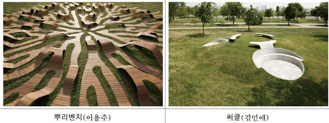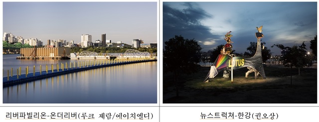 물 위를 직접 걸으며 감상하는 작품(루크제람·에이치엘디의 리버파빌리온-온더리버)부터 나무뿌리가 뻗어나가는 모양을 형상화한 대형벤치(이용주의 뿌리벤치)까지 이색 작품이 곳곳에 설치됐다.