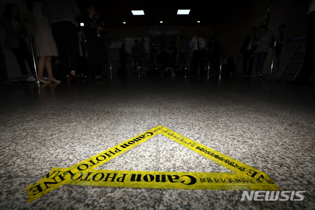 【서울=뉴시스】이윤청 기자 = 웅동학원 허위 소송 및 채용 비리 의혹을 받고 있는 조국 법무부 장관의 동생 조모씨가 영장실질심사(구속 전 피의자 심문)를 포기한 8일 서울 서초구 서울중앙지방법원에 포토라인이 보이고 있다.