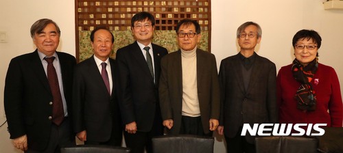 왼쪽부터 최동호 한국시인협회 회장, 이상문 국제펜클럽 한국본부 이사장, 송수근 문체부 장관 직무대행(제1차관), 문효치 한국문인협회 이사장, 최원식 한국작가회의 이사장, 김지연 한국소설가협회 이사장. 2017.02.06. (사진=문화체육관광부 제공)