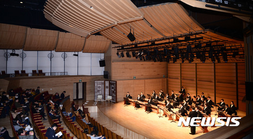 【서울=뉴시스】추상철 기자 = 2017 국립국악원 우면당 재개관 기념 및 신년기자간담회가 열린 7일 오전 재개관을 앞둔 서울 서초구 국립국악원 우면당에서 관현악 산조합주 공연이 펼쳐지고 있다.
