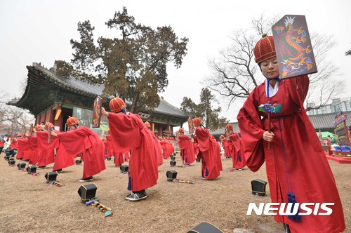 【서울=뉴시스】고승민 기자 = 1일 오전 서울 종로구 성균관에서 열린 공기(孔紀) 2568년(2017년) 춘기석전(春期釋奠)에서 아악일무보존회가 일무를 하고 있다.