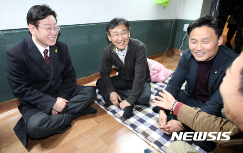 【광주=뉴시스】신대희 기자 = 더불어민주당 대선 경선 후보 이재명 성남시장이 19일 오후 광주 동구 옛 전남도청 원형 보존 농성장을 찾아 5월 단체 관계자들을 만나고 있다. 이 시장은 전국 첫 순회경선지인 호남에 올인하기 위해 이날부터 경선일인 27일까지 광주에 상주하며 서울로 출퇴근하기로 하는 등 호남권 경선에 사활을 걸고 있다. 2017.03.19.