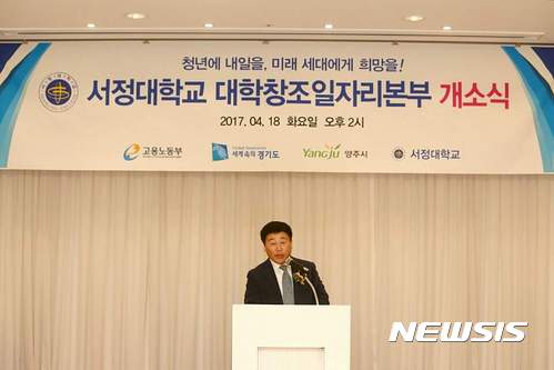 【서울=뉴시스】서정대학교는 18일 경기도 양주시 은현면 화합로 서정대학교 서정관에서 김홍용총장을 비롯한 대학관계자와 이성호 양주시장, 정성호 국회의원, 김영돈 고용노동부의정부지청 지청장, 김화수 경기도 일자리재단 대표이사, 유관기관 관계자 등 100여명이 참석한 가운데 대학창조일자리본부 개소식을 진행했다.