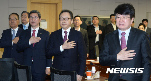 【서울=뉴시스】이영환 기자 = 20일 오전 서울 여의도 국회의원회관 제1세미나실에서 대한민국 미래혁신포럼 주최로 열린 사공일 중앙일보 고문 겸 세계경제연구원 이사장 초청 특강 '세계를 알아야 나라가 산다!'에서 참석자들이 국기에 대한 맹세를 하고 있다.