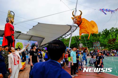 【서울=뉴시스】13일 강서구청(구청장 노현송)이 주최하고 강서구립도서관협의회(회장 김동운)가 주관하는 제9회 강서어린이 동화축제가 서울 강서구 방화근린공원 일대에서 개최됐다. 사진은 한정애 국회의원이 황소연을 시연하고 하늘위로 올라가는 것을 지켜보고 있다 .