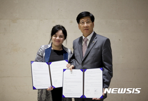 【서울=뉴시스】박주성 기자 = 유스프 샤리프조다 주한 타지키스탄 대사와 정재민 한문화진흥협회 회장은 한국-타지키스탄 수교 25주년을 기념하여 타지키스탄 수도 두샨베에서 양국간 문화교류 행사를 개최하기로 결정해 12일 정재민 회장은 양국간 의상 패션쇼 준비를 위하여 샤리프조다 대사 요청으로 타지키스탄 NEW ERA FASHION HOUSE 니쏘 까유모바 대표와 양해각서를 체결하였다. 2017.05.15. (사진=한문화진흥협회 제공)
