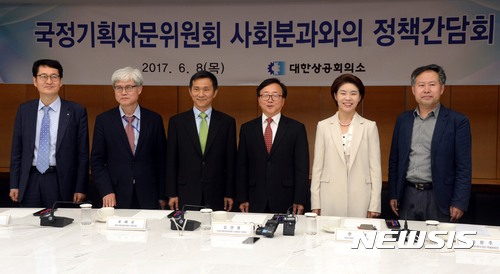 왼쪽부터 이경상 경제조사본부장, 오태규 사회분과위원, 김연명 위원장, 이동근 상근부회장,  한정애 사회분과위원, 정문주 국정기획자문위 특별보좌관. 2017.06.08.