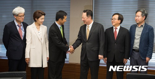 왼쪽부터 오태규 자문위원, 한정애 국회 환노위 민주당 간사, 김 위원장, 박 회장, 이동근 대한상의 상근부회장, 정문주 특별보좌관. 2017.06.08.