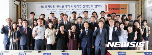 【대전=뉴시스】유순상 기자 = 우송대와 우송정보대의 우송학원(이사장 김성경)이 11일 우송타워 솔파인레스토랑에서 (사)천성원 등 13개 기업과 가족회사 협약식을 체결한 가운데 정상직 우송정보대 총장 등 참석자들이 기념촬영을 하고 있다. 이번 협약에 따라 기업들은 학생들 연수 및 실습기회 제공, 정보교류, 졸업생 채용, 일학습병행제 학위연계형 참여 등에서 협력한다.2017.07.11.(사진=우송정보대 제공)