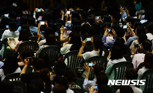 【서울=뉴시스】김진아 기자 = 12일 서울 동대문구 한국외국어대학교에서 열린 2018 한국외대 수시모집 지원전략 설명회에 참석한 학부모와 학생들이 강의 자료를 사진으로 촬영하고 있다.