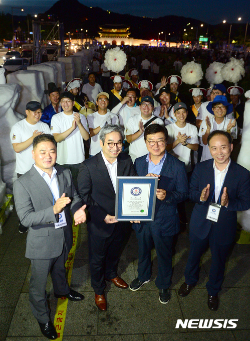 【서울=뉴시스】권현구 기자 = 12일 오후 서울 종로구 광화문광장에서 열린 '크라운-해태제과 한여름밤 눈조각전'에서 조덕원(오른쪽 두번째) 크라운-해태제과 이사가 김덕은 한국기록원 원장에게 한국 기록 인증서를 받고 있다.