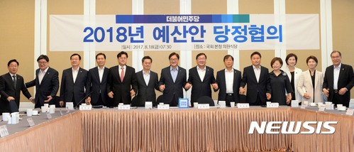 【서울=뉴시스】홍효식 기자 = 18일 오전 서울 여의도 국회 귀빈식당에서 열린 2018년 예산안 당정협의에 참석한 더불어민주당 우원식(왼쪽 일곱번째) 원내대표와 김동연(왼쪽 여섯번째) 경제부총리 겸 기획재정부 장관 등이 기념촬영을 하고 있다. 왼쪽부터 박범계 법사위 간사, 김용진 기재부 2차관, 민홍철 국토교통위 간사, 이학영 정무위 간사, 홍익표 정책위 수석부의장, 김 부총리, 우 원내대표, 김태년 정책위의장, 윤후덕 예결위 간사, 김영진 의원, 진선미 행정안전위 간사, 유은혜 교문위 간사, 한정애 제5정책조정위원장, 이개호 농해수위 간사. 2017.08.16.