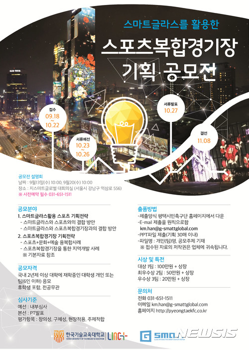 【천안=뉴시스】이종익 기자 = 충남 천안의 코리아텍은 가족기업인 지스마트㈜와 18일부터 22일까지 스포츠문화 활성화 기여와 비공학 캡스톤디자인 확산을 위한 '스포츠복합경기장 기획 공모전'을 진행한다고 11일 밝혔다. 전국 대학(원)생을 대상으로 진행하는 이번 공모전은 스마트글라스활용 스포츠 기획전략과 스포츠복합경기장 기획전략 2가지 분야로 나눠 열린다. 2017.09.11. (사진=코리아텍 제공)