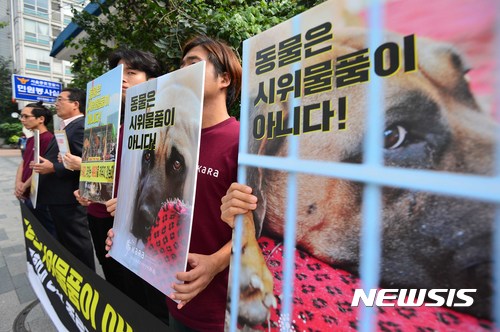 이는 지난 22일 대한육견협회가 세종로공원에서 개고기 합법화 집회를 열 당시 식용으로 사육된 개들을 데려온 것에 따른 기자회견으로, 카라는 종로경찰서가 이를 방관했다고 지적했다. 2017.09.27.