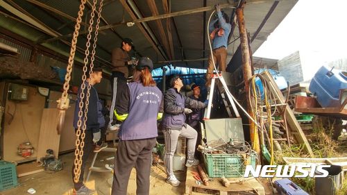 【천안=뉴시스】이종익 기자 = 충남 천안의 코리아텍(총장 김기영)은 기계공학부·메카트로닉스·전기전자통신공학부 등 43명으로 구성된 봉사단이 27일부터 29일까지 충남 청양군 대치면 칠갑산 산꽃마을에서 기술봉사와 농촌봉사활동을 펼쳤다고 30일 밝혔다. 학생들이 노후 가옥 전기 배선 수리 및 형광등을 교체하고 있다. 2017.10.30. (사진=코리아텍 제공)