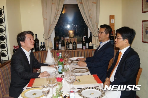 【프랑크푸르트(독일)=뉴시스】김난영 기자 = 4차 산업혁명 대비책과 한반도 안보위기 해법 모색을 위해 독일-이스라엘로 출국한 안철수 국민의당 대표(맨 왼쪽)와 최명길 최고위원(가운데)이 3일(현지시각) 독일 프랑크푸르트 한 식당에서 백범훈 주프랑크푸르트 총영사와 만찬을 갖고 있다.