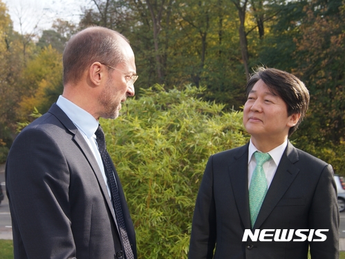 【프랑크푸르트(독일)=뉴시스】김난영 기자 = 안철수 국민의당 대표가 4일(현지시각) 독일 인공지능연구센터 앞에서 안드레아스 뎅엘 교수와 대화를 나누고 있다.