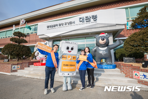 【서울=뉴시스】고승민 기자 = 18일 bbb 코리아 임직원들이 강원도 대관령 면사무소에서 2018 평창동계올림픽 성공개최를 염원하며 무료 언어통역 서비스를 홍보하고 있다.