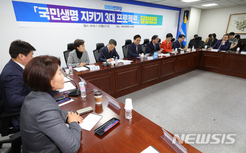 【서울=뉴시스】배훈식 기자 = 우원식 더불어민주당 원내대표를 비롯한 원내지도부와 장관들이 22일 오전 서울 여의도 국회 의원회관에서 열린 국민생명 지키기 3대 프로젝트 추진계획 마련을 위한 당정협의를 하고 있다. 왼쪽 아래부터 시계방향으로 한정애, 기동민 의원, 김현미 국토교통부 장관, 박능후 보건복지부 장관, 우 원내대표, 김태년 정책위의장, 김영주 고용노동부 장관, 조정식 국토교통위원장, 박홍근 원내수석부대표. 2018.01.22.