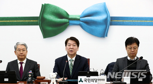 【서울=뉴시스】이영환 기자 = 국민의당 안철수 대표가 2일 오전 서울 여의도 국회 당 대표실에서 열린 최고위원회의에 참석해 발언을 하고 있다. 김동철(왼쪽부터) 원내대표, 안철수 대표, 장진영 최고위원.