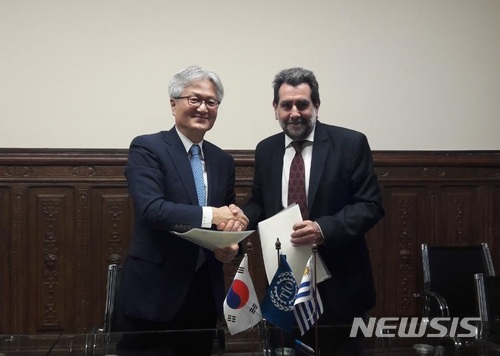 【천안=뉴시스】이종익 기자 = 충남 천안의 코리아텍은 김기영 총장(왼쪽)이 지난 6일 우루과이 현지에서 미주 지억업훈련 지식개발센터(ILO CINTERFOR)와 직업교육대학협의체 분야 협력 강화 등을 위한 협약을 체결했다고 8일 밝혔다. 이번 협약으로 양 기관은 ▲직업훈련교사 대상 기술연수 프로그램 개발 ▲증강현실 등 교육기술개발 ▲TVET(직업교육대학협의체) 분야 공동워크숍 개최 등에 나선다. 2018.04.08. (사진=코리아텍 제공)
