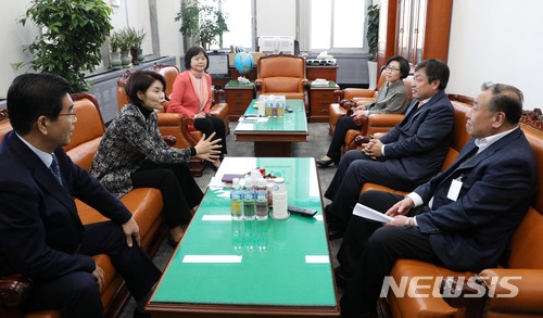 【서울=뉴시스】홍효식 기자 = 11일 오전 서울 여의도 국회 본청 환경노동위원회 소회의실에서 최저임금법 개정 관련 의견 청취의 건 관련 고용노동소위원회가 열리기 앞서 자유한국당 문진국(왼쪽부터), 더불어민주당 한정애, 정의당 이정미, 바른미래당 김삼화 의원과 어수봉(맨 오른쪽) 최저임금위원장이 회의 시작을 기다리며 대화를 나누고 있다. 2018.04.11.