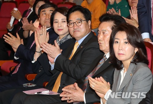 【서울=뉴시스】홍효식 기자 = 20일 오후 서울 여의도 국회 의원회관에서 열린 '제38회 장애인의 날' 기념 서울장애인합창예술제에 참석한 내빈들이 박수를 보내고 있다. 오른쪽부터 자유한국당 나경원 의원, 국제장애인문화교류협회 중앙회 최공열 이사장, 더불어민주당 우원식 원내대표, 유은혜, 이종걸 의원. 2018.04.20.