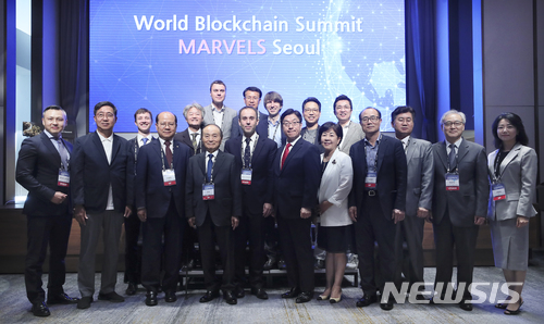 【서울=뉴시스】 최진석 기자 = 18일 오후 서울 송파구 잠실롯데월드타워 시그니엘서울에서 열린 '월드블록체인서밋 마블스 서울 2018' VIP초청 파티에 참석한 박봉규 코리아씨이오서밋 이사장 겸 월드블록체인서밋 마블스 회장을 비롯한 참석자들이 기념촬영을 하고 있다.